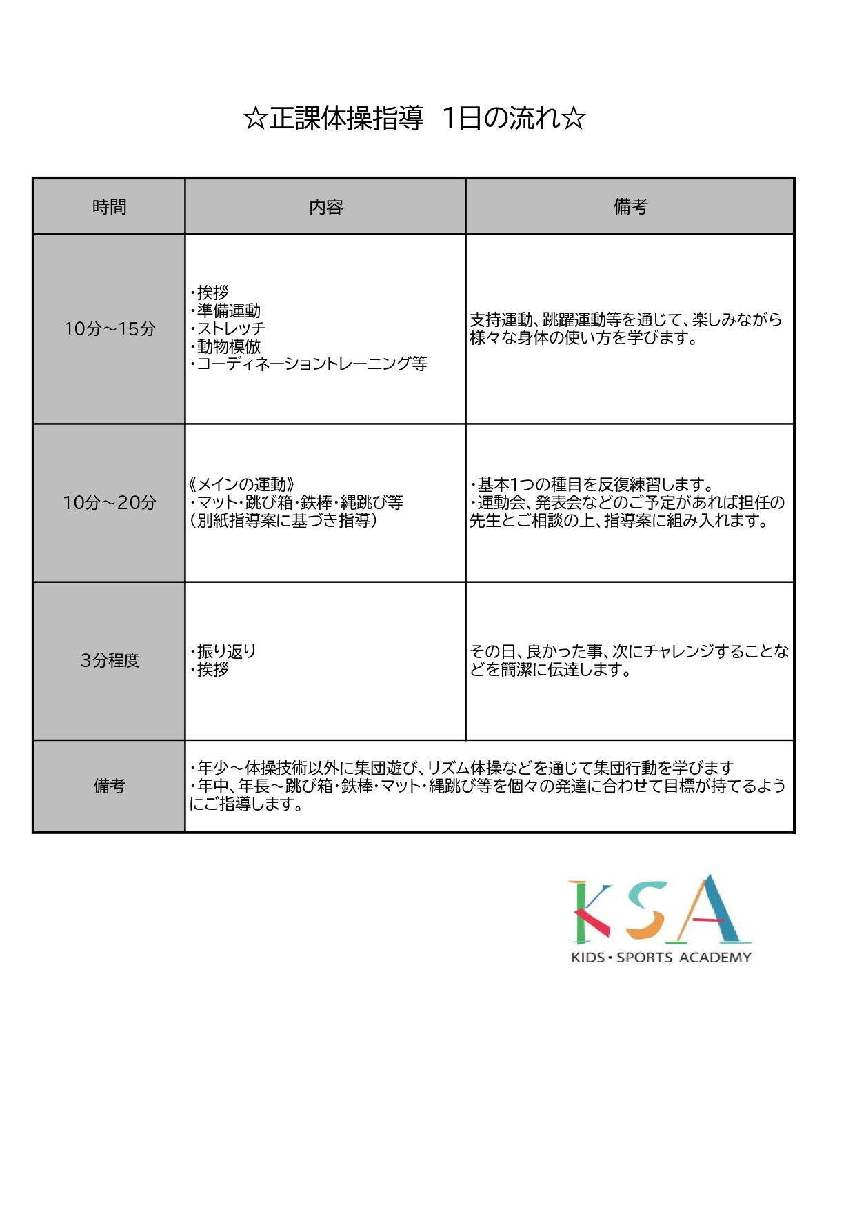 指導にあたっては園や学校の教育理念のもと、『オリンピックで金メダルを目指す!』と言うよりは、『運動会で1等賞を目指す!』といった身近な目標達成や、お子様のスポーツに対する苦手意識の克服の為に経験豊富な指導員がご指導させて頂きます。
