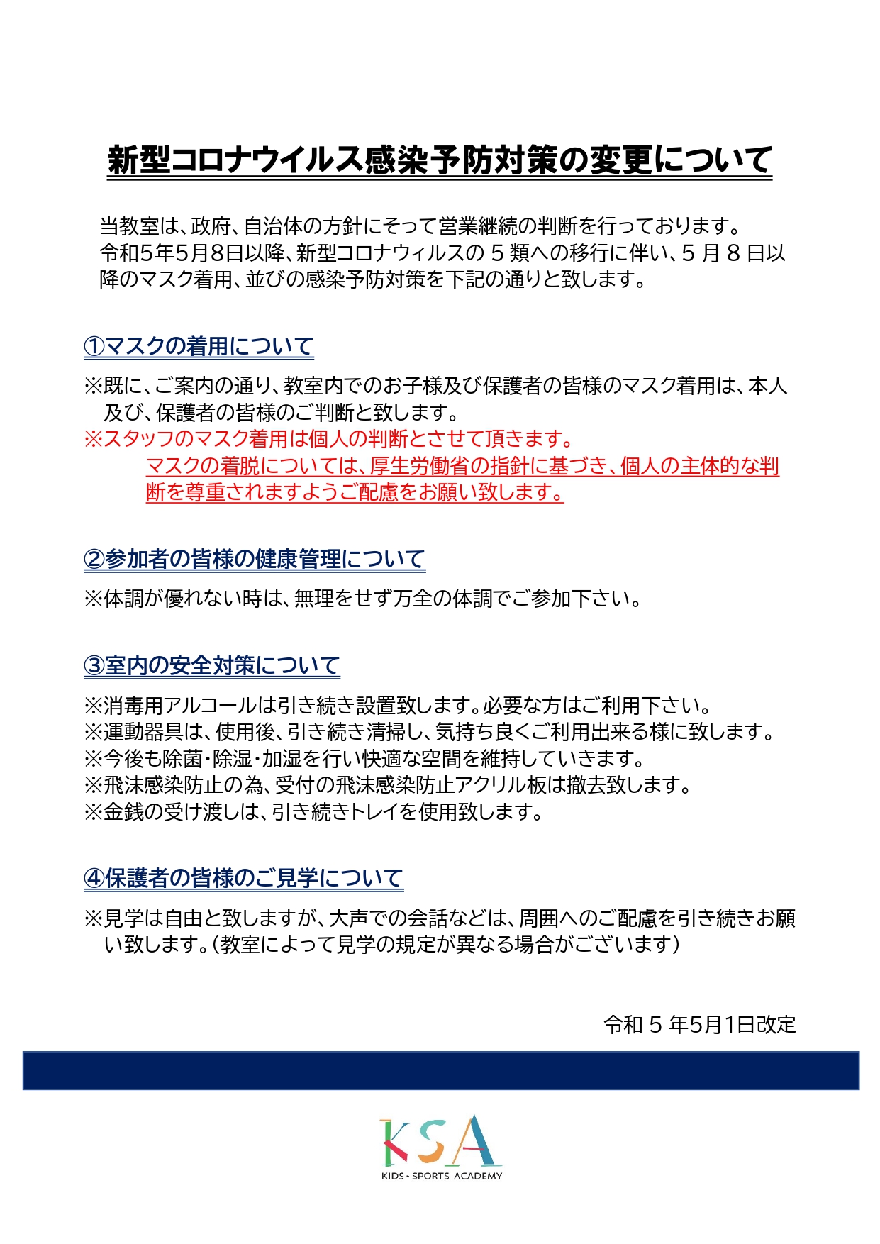 2022年6月11日 / 最終更新日 : 2023年5月3日 kidsacademy コロナウィルス感染防止対策 保護者の皆様へ 令和5年5月8日以降、新型コロナウィルスの5類への移行に伴い、5月8日以降のマスク着用、並びの感染予防対策を下記の通りと致します。 新型コロナウィルス対応方針(5.1-改定)はこちらをクリック コメントを残す コメントをキャンセルメールアドレスが公開されることはありません。 ※ が付いている欄は必須項目ですコメント ※ 名前 ※ メール ※ サイト 次回のコメントで使用するためブラウザーに自分の名前、メールアドレス、サイトを保存する。 上に表示された文字を入力してください。